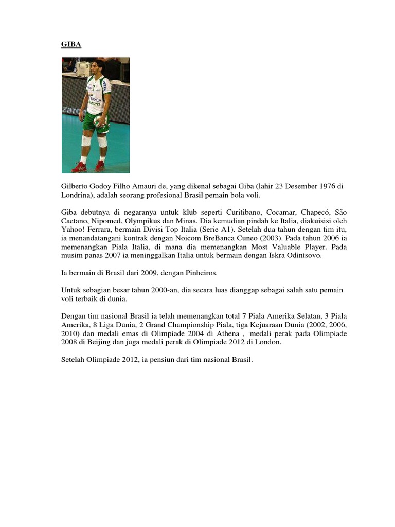 Mungkin ketika ditanya tentang siapa perenang terbaik dunia akan otomatis terlintas nama Michael Phelps namun sebenarnya bukan hanya ia saja yang disebut sebagai perenang. Giba Brasil Pemain voli dengan nama lengkap Giberto Amaury de Godoy Filho ini asal Brasil dan kini usianya sudah menginjak 40 tahun. Olimpiade merupakan ajang olahraga terbesar di dunia yang diselenggarakan setiap empat tahun.